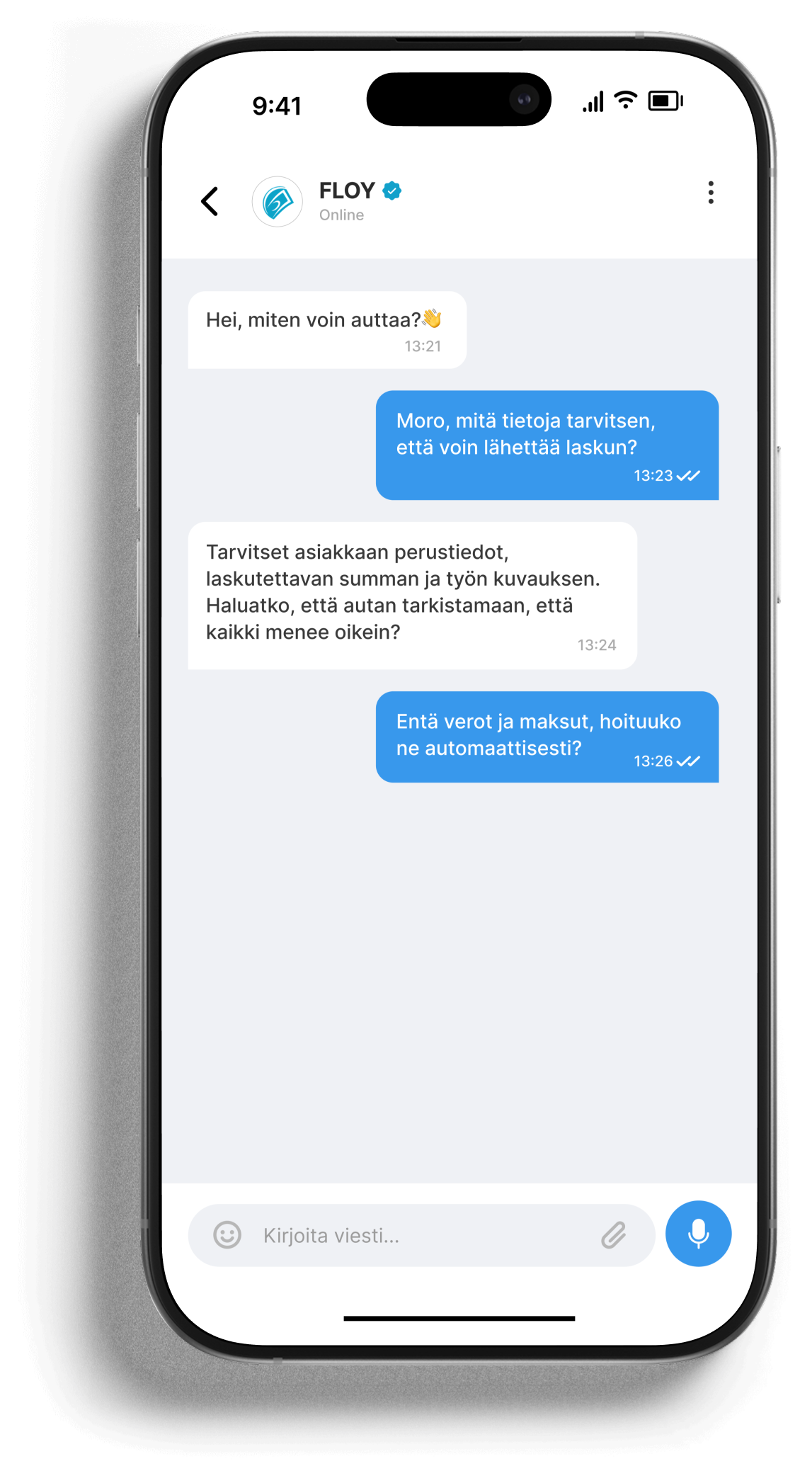 FLOY hoitaa puolestasi arvonlisäveron ja ennakonpidätyksen, joten sinun ei tarvitse huolehtia veroista. Huolehdimme myös sairausvakuutusmaksun ja vakuutusmaksut puolestasi.